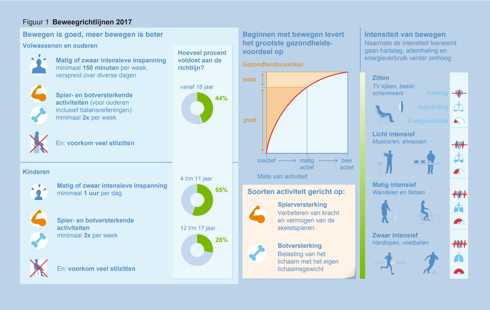 Je beweegt bijvoorbeeld matig intensief als je stevig wandelt of flink doorfietst. Aanbevolen in Nederland is om tenminste 30 minuten per dag te bewegen. Iedereen zou moeten streven naar de Nederlandse beweegrichtlijnen.