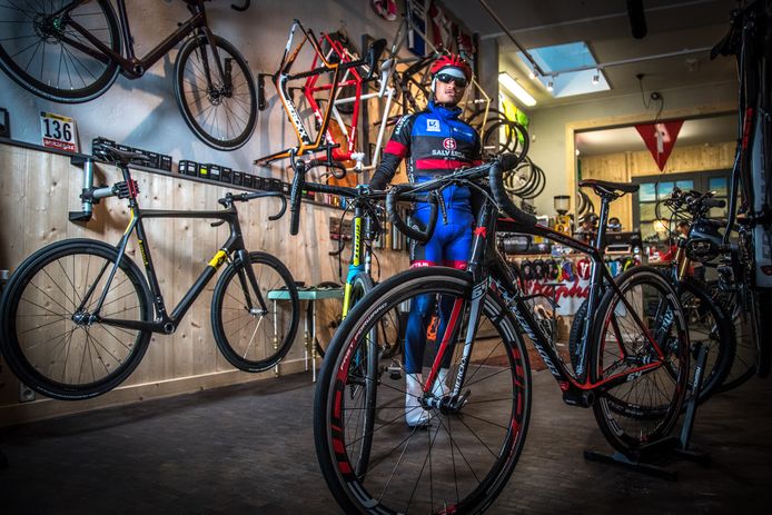 Maar de gaatjes worden niet alleen vanzelf gedicht. Hoe trager men rijdt hoe minder de fiets moet kantelen om door de bocht komen. Afgemonteerd met Shimano Dura-Ace een Fizik zadel en slofjes van Vittoria.